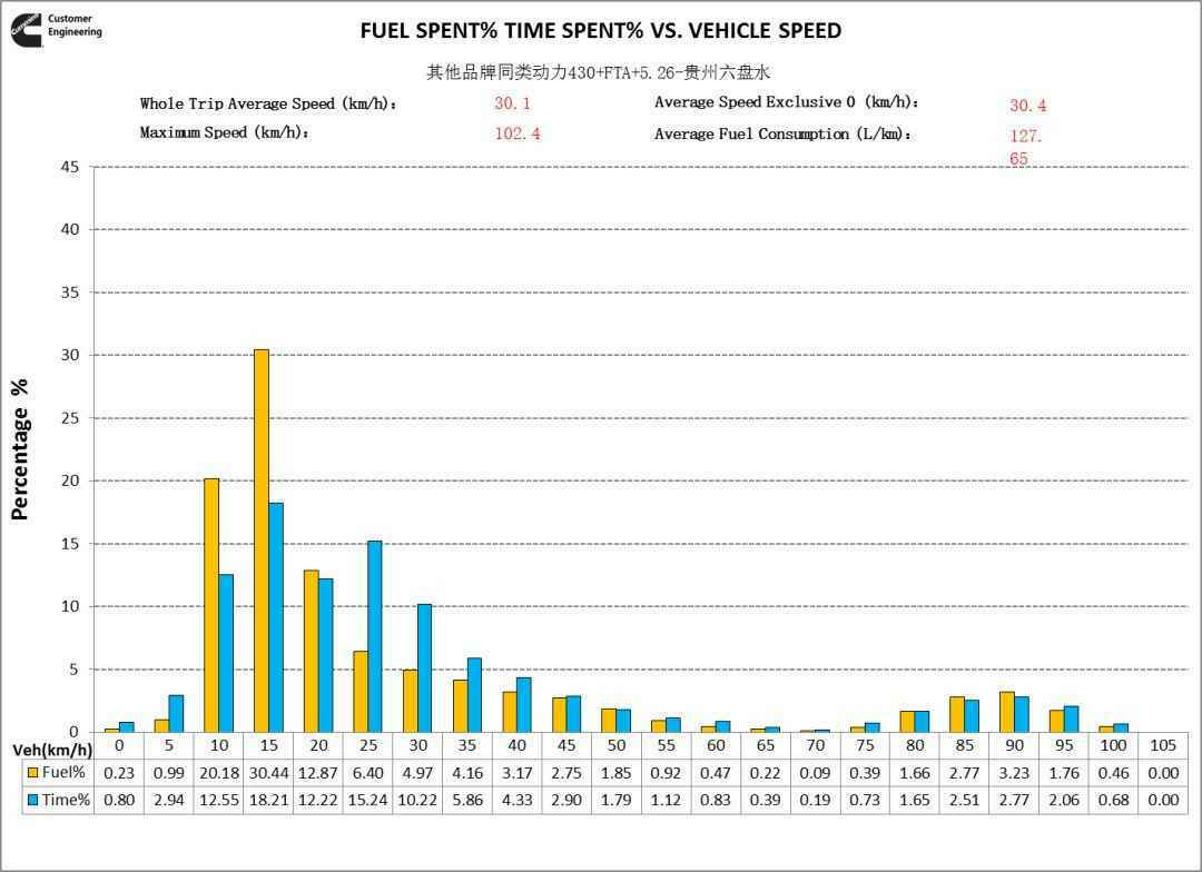 从车速分布看,在重载低速段,配装福康X12动力的欧曼自卸车辆的车速高于其他车辆,说明在重载工况,福康X12动力性优于其他品牌动力。这个数据结果与广大用户反馈相符。