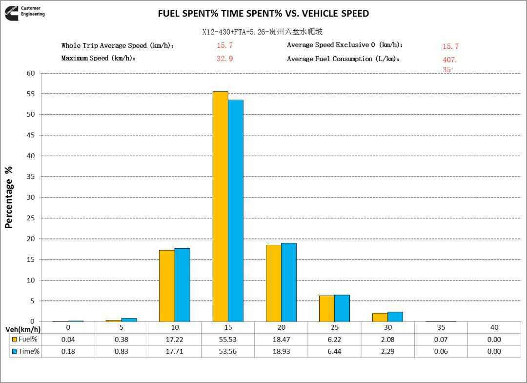 数据分析结果显示:配置福康X12动力的欧曼自卸车辆经济性在全程运行和爬坡运行两个工况均优于其他车辆。